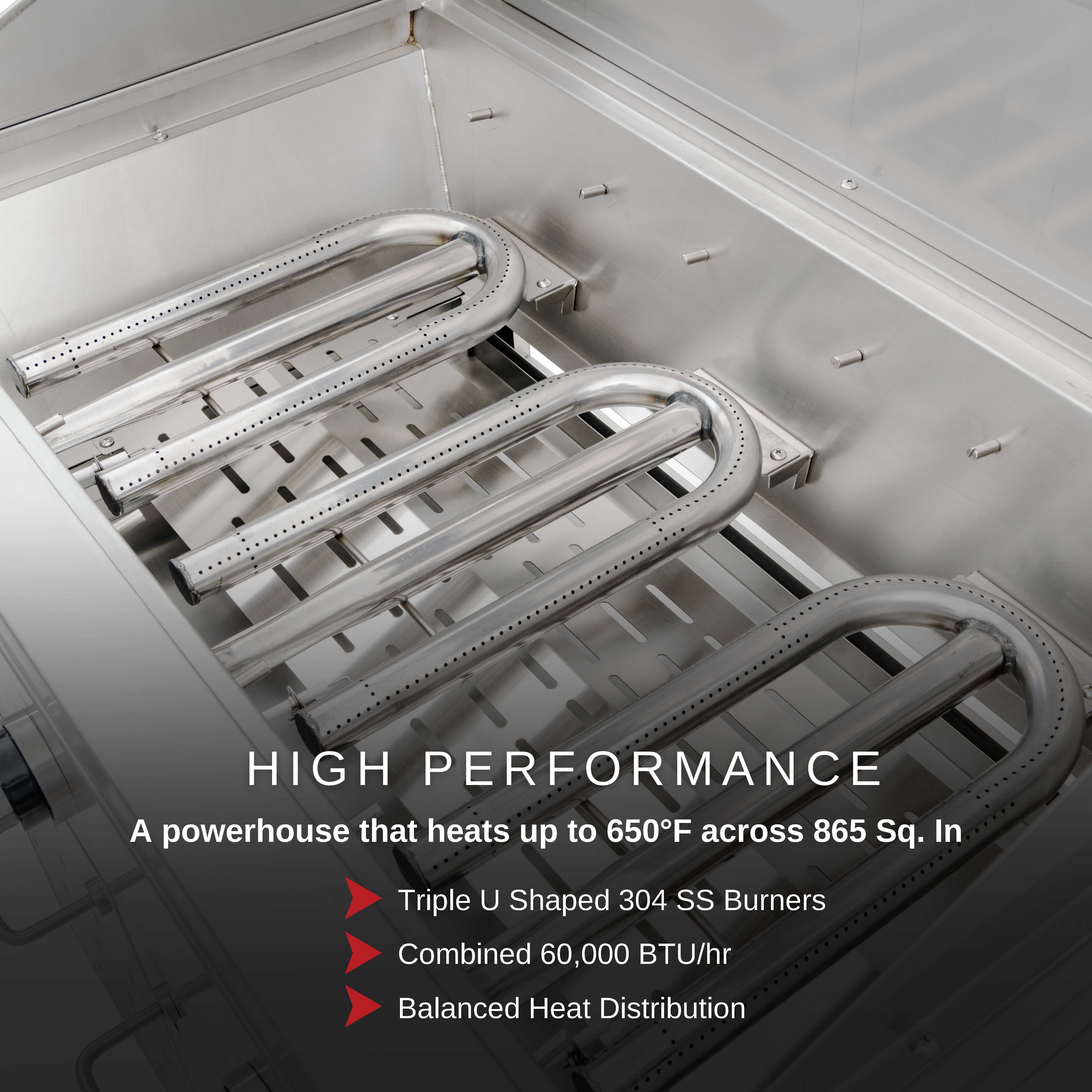 This gives the balance and uniform heat you are looking for in a premium gas grill. Our 304SS burners and their 304SS diffusers come with a five year warranty. As with all of our grills it heats up to 500F in just minutes and maintains temperatures from 250F-650F.